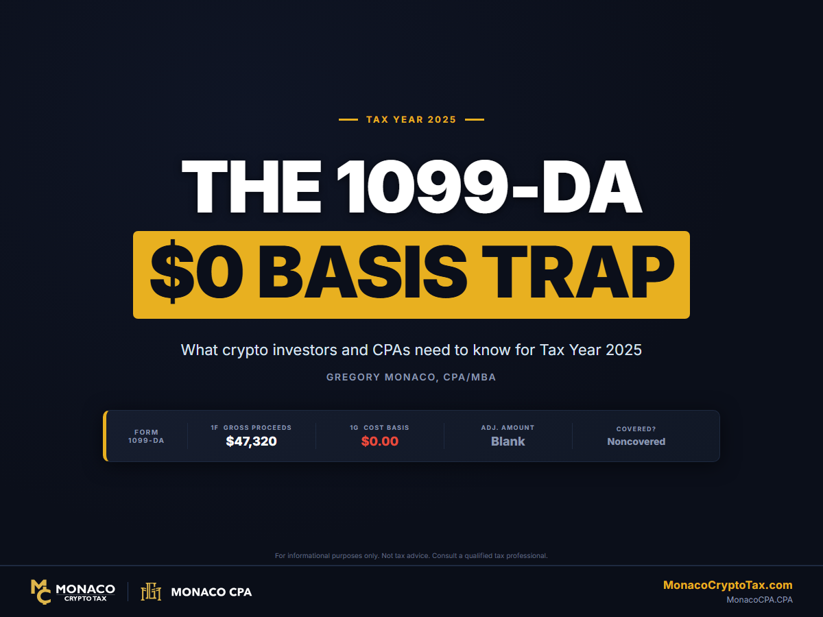 Form 1099-DA is being issued for the first time for Tax Year 2025, and the biggest trap is blank or $0 cost basis. Brokers are not required to report basis this year, which means every taxpayer must reconstruct their own cost basis from personal records or risk the IRS treating their entire proceeds as gain. Reconcile your 1099-DA against your exchange CSV, reconstruct basis for every disposition, and route transactions to the correct Form 8949 boxes (G/H/I for short-term, J/K/L for long-term). If you are unsure, have your 1099-DA professionally reviewed before you file.